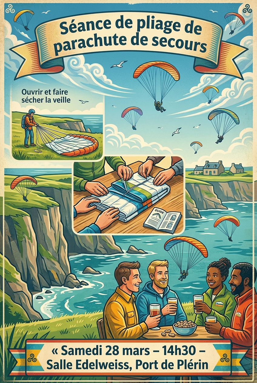 Cette séance est ouverte à tous les pilotes du club. C’est l’occasion de vérifier ensemble le bon état du matériel, d’échanger les bonnes pratiques et de bénéficier de conseils pour un pliage soigné et efficace.